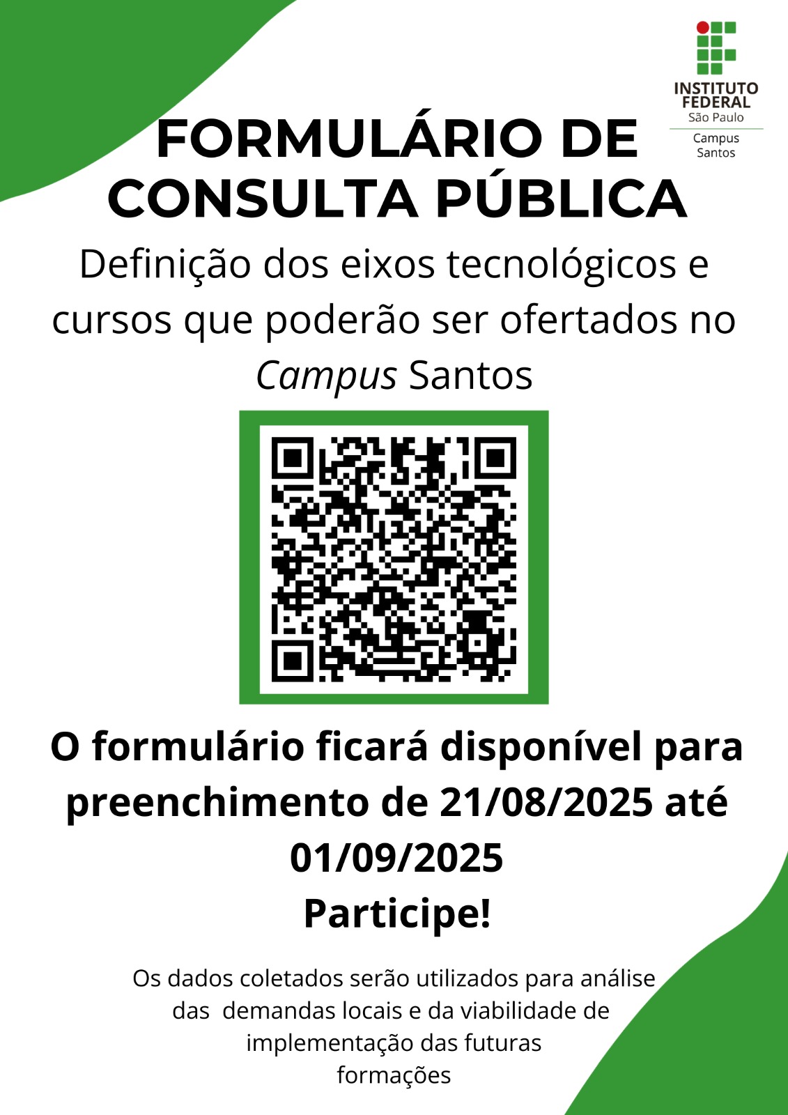 A sua participação é fundamental para garantir que o IFSP – Campus Santos seja construído em sintonia com as vocações do município e com as expectativas da comunidade.